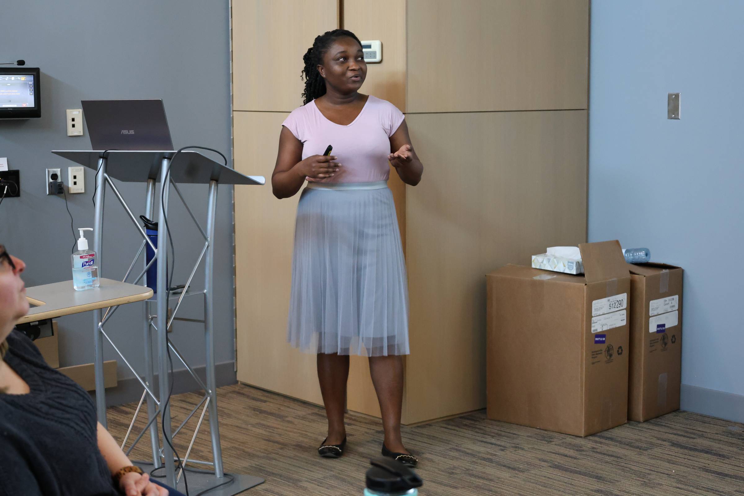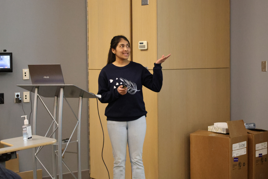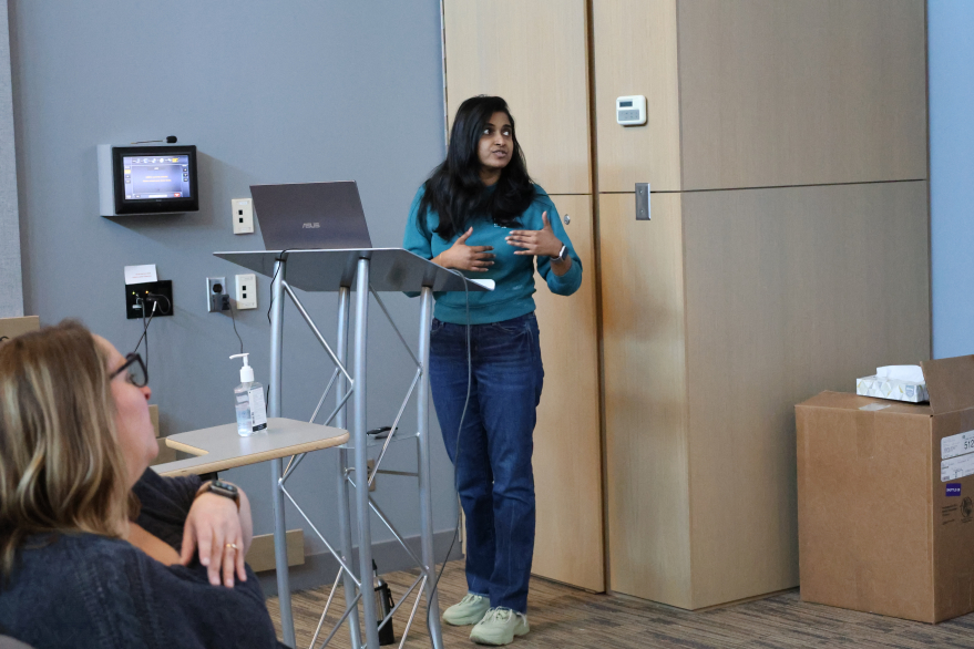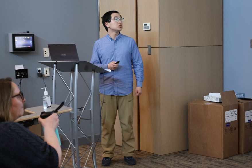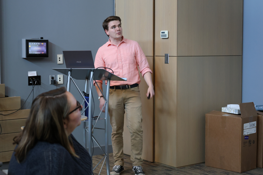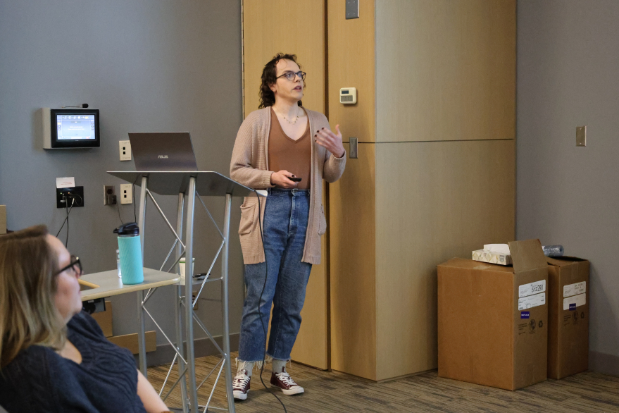 A student is immersed in their presentation during the Earth Sciences Graduate Symposium.