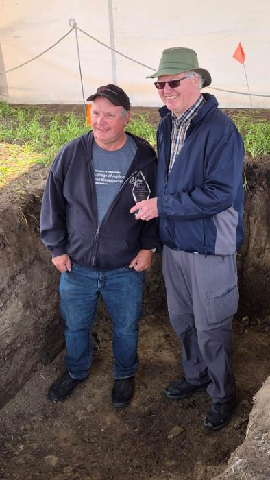 Dr. Don Flaten, Professor Emeritus of the Department of Soil Science at the University of Manitoba, has been announced as the 2025 recipient of the Les Henry Award. The official presentation of the award from Dr. Jeff Schoenau to Dr. Flaten took place during Ag in Motion in the soil pit at the University of Saskatchewan booth near Langham, SK.