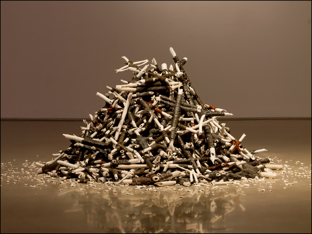 Monica’s thesis exhibition, installed in the School of Art Gallery in ARTlab in 2012, was powerful and poignant. Referencing her Chilean background Monica created hundreds of porcelain bones wrapped in red earthenware clay and stacked them up into a mountain-like shape on the gallery floor. Her thesis exhibition titled everyone is fallen except for us fallen… represented the skeletons of those tossed out of helicopters above the Atacama Desert during the reign of Augusto Pinochet, military dictator of Chile from 1973 to 1990. Monica moved from Chile to Alberta when she was three years old. She talked about inherited generational trauma, and her thesis exhibition allowed her to dive deeply into reflecting on her cultural history and the impact it had on her family. “As a Chilean who grew up on the Canadian Prairies, she uses her practice to discuss the historical foundations that influence how we define who we are and where we belong” (returnatacama.com/whoweare).