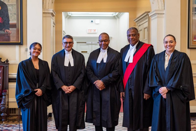 Moot Champions with Final Round Judges, left to right: Talia David, Justice Mahmud Jamal (SCC); Chief Justice Michael H. Tulloch (OCA); Associate Chief Justice Aston J. Hall (OCJ); Quinn Thomas. Photo credit: Blessing Uja, BLSAC.