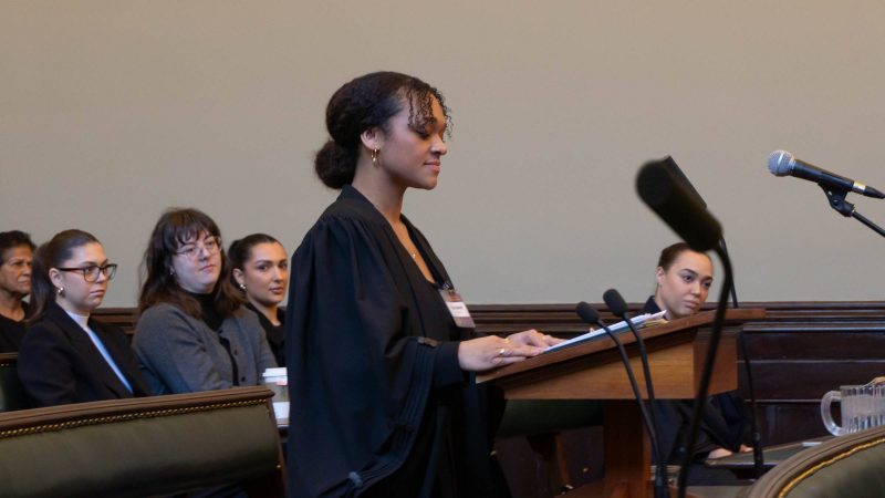 Talia David presents her argument for the Appellant team while her teammate Quinn Thomas listens. Fellow Manitoba team members Kennedee Hills and Kira Wardrop listen in the row behind. Photo credit: Blessing Uja, BLSAC.