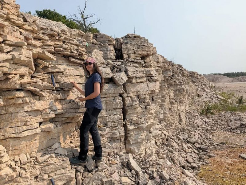One of the quarries near Lake Manitoba, where Elmosteus was found. Fossils were collected from the layer where the hammer is placed. Dr Jobbins for scale.