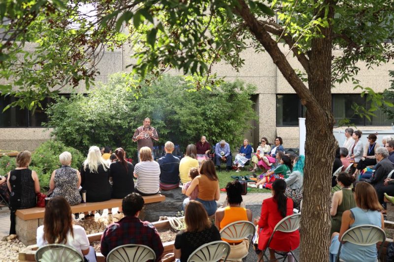 The morning began with the lighting of a Sacred Fire and a Pipe Ceremony in Mashkiki Gittgaan – Medicine Garden. The space was filled with members of the Rady Faculty community.