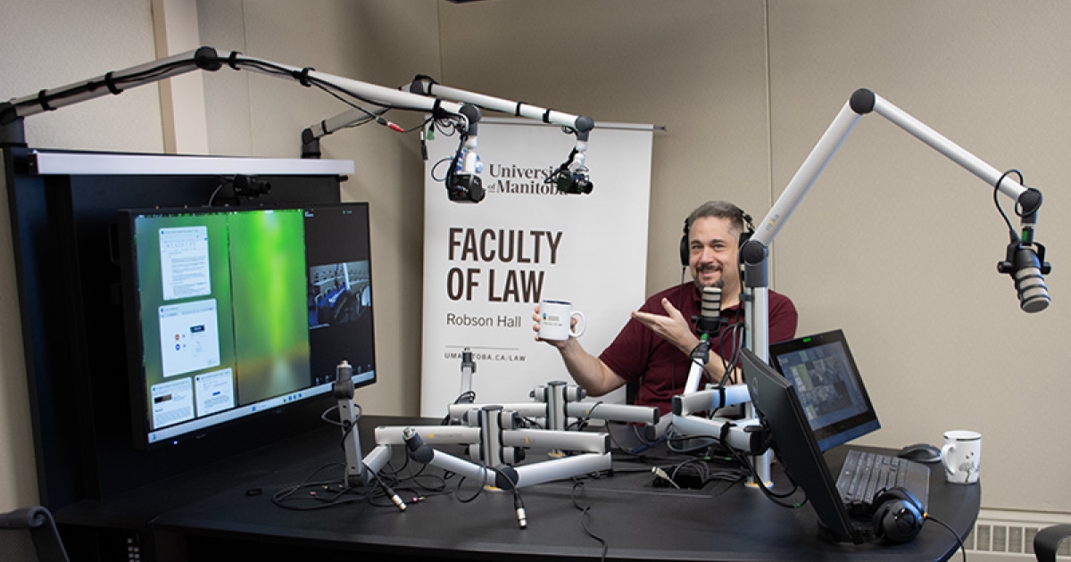 The odd little table covered with monitors, bending arms and cables in the northwest corner of Robson Hall’s MLT Aikins Classroom (room 206) is – a podcast studio. The only one of its kind thus far on the Fort Garry Campus, it is intended to be used by the Faculty of Law for a variety of innovative and dynamic teaching and learning situations. Added by MLT Aikins LLP as a continuation of upgrades the western Canadian law firm has sponsored in room 206 at Robson Hall, the studio was completed late fall, 2024.