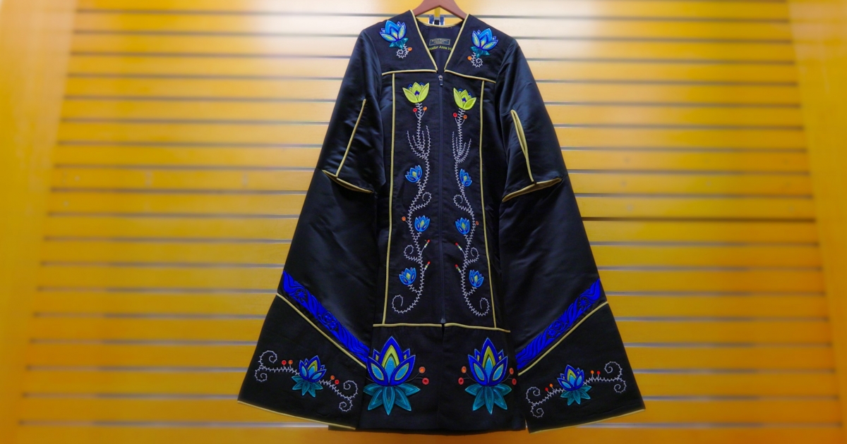 The new robes were designed by Beverli Barnes with artist Jackie Traverse [BFA/09], an Ojibwe woman from the Lake St. Martin First Nation, designing the floral motifs. Barnes then sewed the robes, including the embroidery of Traverse's motifs, after which the robes were beaded by a third artist, Shannon Denney-Edwards, a Canadian of Métis, French and Islandic descent.