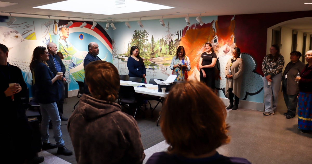 The afternoon also included the unveiling of a new mural by artist Mike Valcourt. Bright, expansive, and full of movement, the mural adds a powerful visual presence to the room while reflecting the values of creativity, storytelling, and cultural continuity. As a permanent feature of the ISS, it also signals the importance of Indigenous visual culture within the School of Art’s shared spaces.