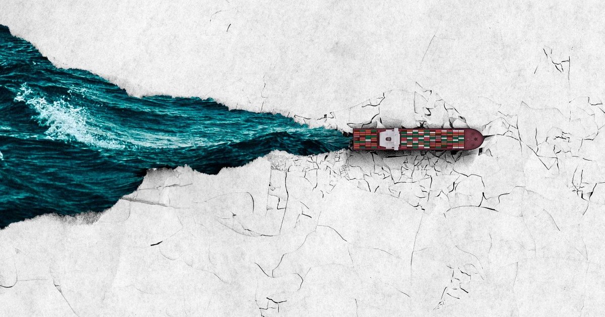 A cargo ship moves through Hudson Bay toward the Port of Churchill. For millennia, ice covered these waters most of the year. Now climate change is shortening the ice season, leaving more time for ships to pass.