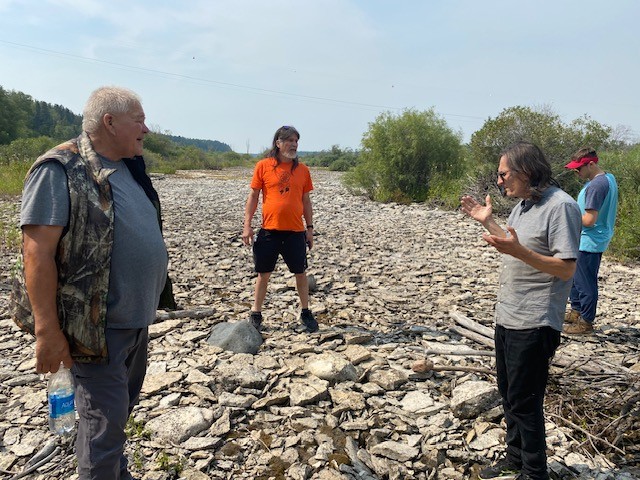 Ernest Turner (left) from Misipawistik Cree Nation (Grand Rapids) speaks with Peter Kulchyski and the group. They stand on the dry riverbed where the Grand Rapids once flowed, a place of deep cultural, spiritual, and economic significance to the community.